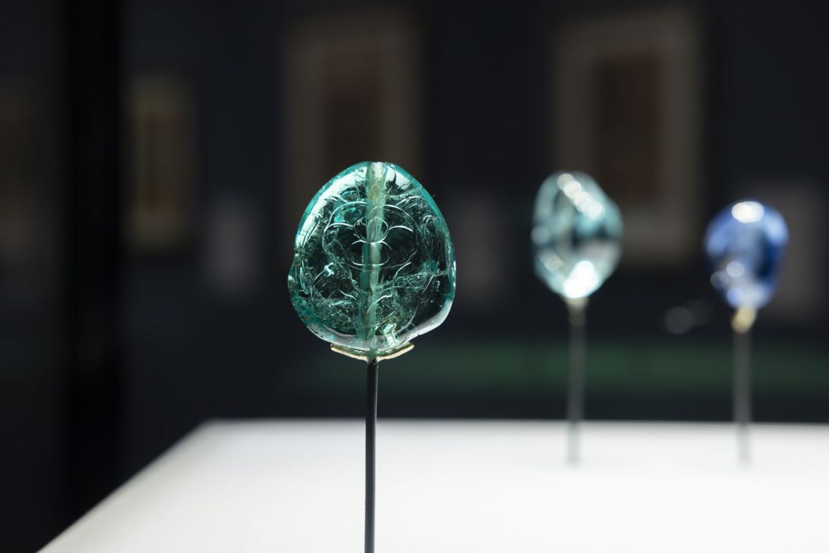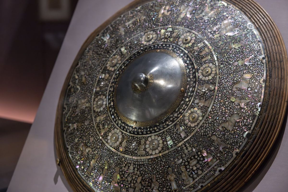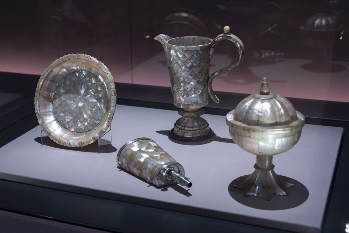 Bellissima anche la brocca di inizio XVII secolo (Gujarat, India), interamente ricoperta di madreperla con spille in metallo e oro. Preziosissimi alcuni pendenti di smeraldi e rubini, di grandi dimensioni, incisi con scritte in arabo.