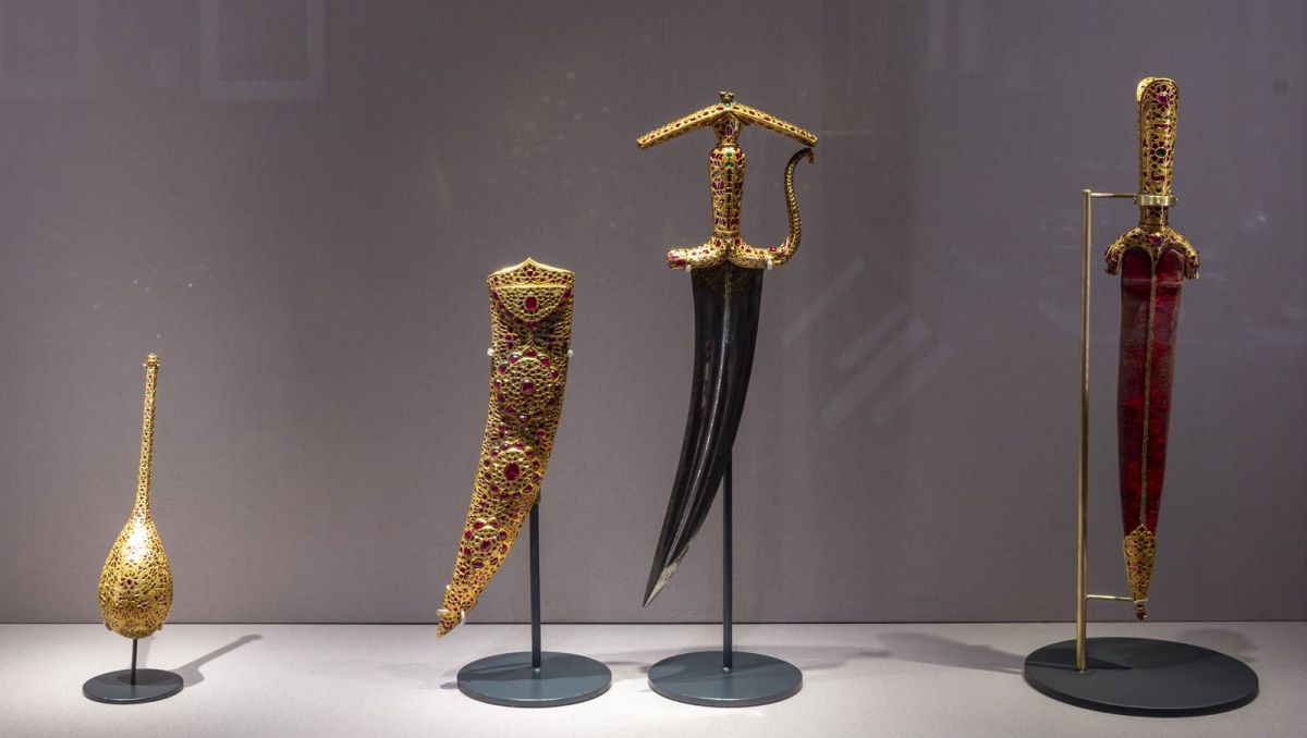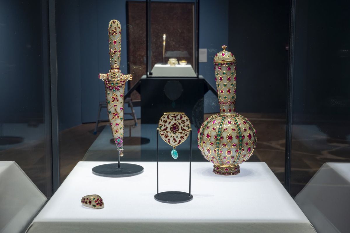A testimoniare tutto ciò, ci sono gli oltre 200 oggetti in mostra al V&A Museum di Londra, molti dei quali esposti per la prima volta, provenienti dalla collezione permanente del Victoria and Albert Museum oltre che da preziose ed importanti collezioni internazionali di arte, moda e design. Tra questi possiamo ammirare un preziosissimo cucchiaio cerimoniale realizzato in oro e argento e ricoperto di diamanti, smeraldi, rubini incastonati con estrema precisione e raffinatezza sul manufatto (arte Moghul, 1660 ca). Sono inoltre esposte meravigliose stoffe in mussola, seta o lino finemente ricamate (anche con fili d'oro) per realizzare tessuti, abiti, giacche, scialli, vesti cerimoniali e tappeti, provenienti da varie aree geografiche e realizzati in oltre un secolo di storia. Particolarmente belli sono alcuni dipinti ad acquerello e pasta d'oro, realizzati su tele o pergamene risalenti al XVII secolo, durante la dinastia Mughal; tra questi ricordiamo il ritratto di Shah Jahan con in mano uno smeraldo, di Muhammad Abed, (1628 circa, Agra, Indi) e il quadro che ritrae un viaggiatore europeo (1556-1605, Mughal).